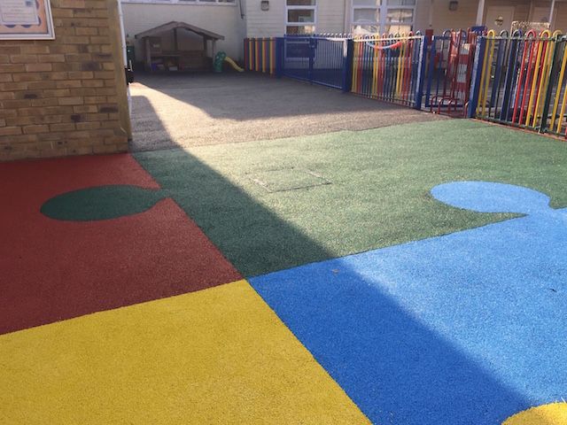 Bonded rubber can be laid to large surface areas such as playgrounds or kept to smaller areas beneath certain play structures or pieces of equipment. Our surfacing is available in various thicknesses to meet individual needs and in a large range of bright colours, which can be laid as creatively as you would like. Bold and bright blocks, fun splashes, jigsaw pieces and various pattern designs add colour and a whole new dimension to your play areas.